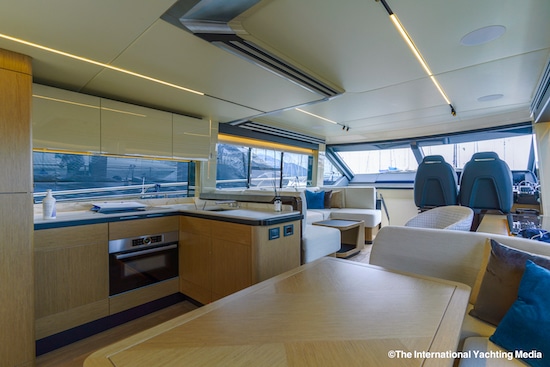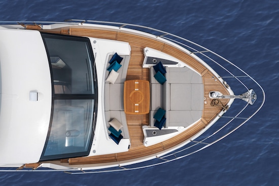 Sur le pont supérieur, la zone fly crée un deuxième salon en plein air donnant sur le paysage environnant sans limites. Il s’agit d’un espace à vivre, avec une cuisine, une salle à manger et un coin détente, aux lignes élégantes, aux couleurs contrastées et aux finitions agréables. C’est également là que se trouve la deuxième console de pilotage, également de haut niveau technologique, entourée d’un autre grand sundeck.