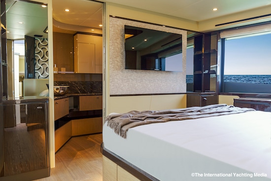 Un exemple ? La cabine VIP est en fait une deuxième Master. Également dotée d’un lit king-size, elle dispose d’une salle de bains privée avec douche séparée et de grandes fenêtres à l’avant de la cabine. Une troisième cabine, avec des lits simples et des lits jumeaux et une salle de bain, complète la zone de couchage du pont inférieur.