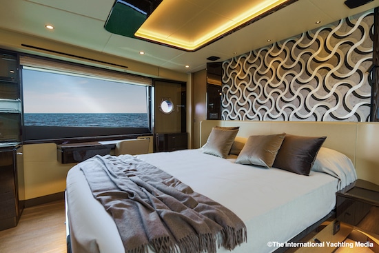 Absolute en revanche, a bouleversé l’architecture des espaces intérieurs et ramené la cabine principale à l’avant sans sacrifier l’espace auquel la cabine du propriétaire a droit à juste titre. Cette magie a été rendue possible par de longues études de modélisation en 3D qui, grâce à la forme innovante de la proue et à la position avancée de la salle de bains, ont permis de libérer un espace aussi vaste qu’imperceptible de l’extérieur.