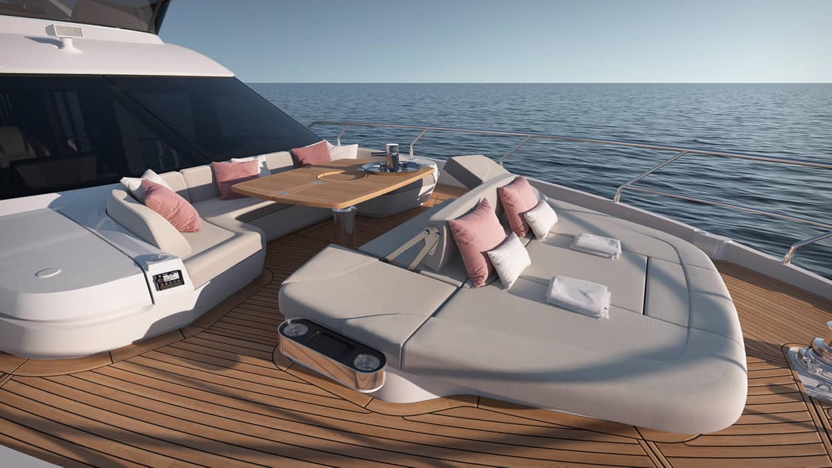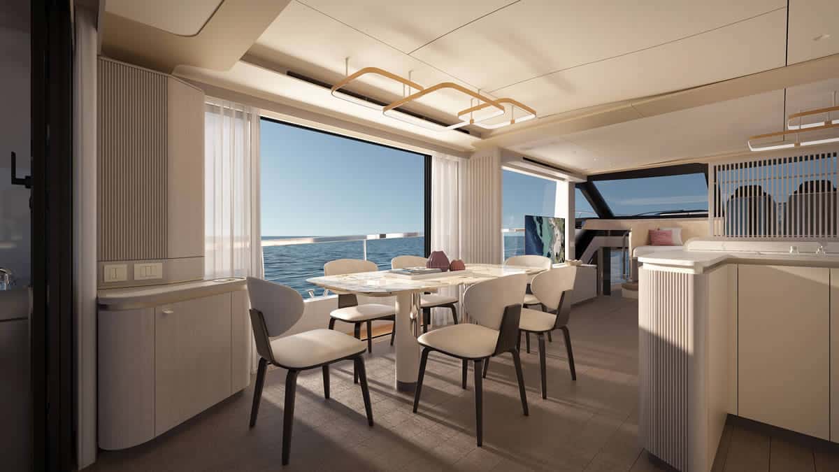 L’architecture innovante du 70 Fly minimise les barrières entre l’intérieur et l’extérieur : peu importe où l’on se trouve à bord, on se sent en parfaite communion avec la mer. La nouvelle porte coulissante à six vantaux sur le côté gauche du salon agrandit la salle à manger, offrant un équilibre parfait entre le confort intérieur et le plaisir d’un dîner en plein air avec la brise marine dans les cheveux. Il s’agit de l’une des caractéristiques principales de ce yacht, étant une dotation unique pour un bateau de cette taille.