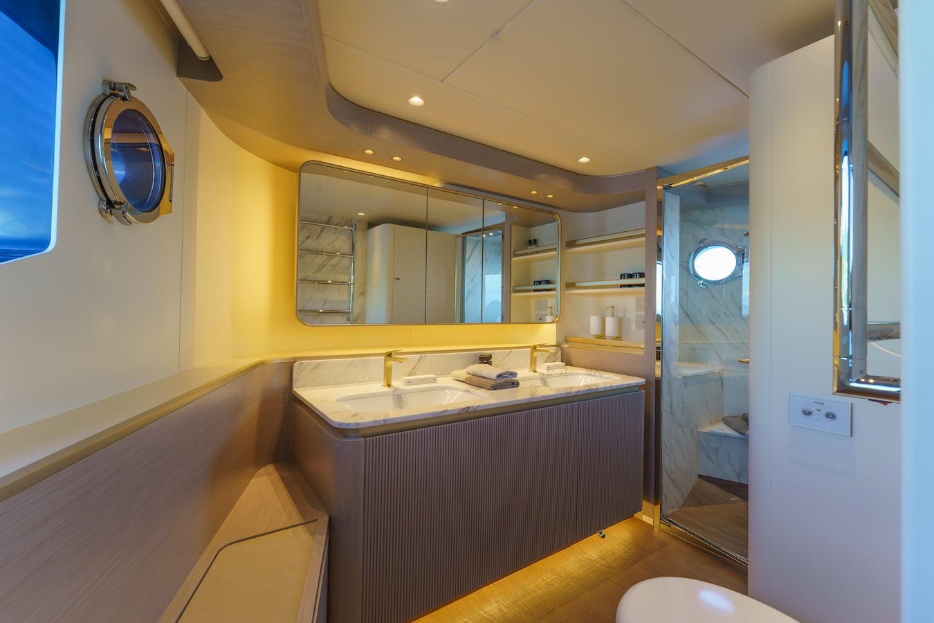 Les intérieurs reflètent le soin maniaque typique du chantier. Le pont principal est un espace lumineux et aéré grâce aux grandes baies vitrées pleine hauteur qui abolissent la frontière avec la mer. La cuisine en U est entièrement équipée et ouverte sur le salon, où deux grands canapés et une table centrale créent une atmosphère conviviale. Les matériaux choisis — bois clairs, marbres naturels et tissus doux — expriment élégance et confort sans excès, avec une cohérence stylistique propre à toute la gamme Absolute. La cabine propriétaire, située au milieu du bateau, est un chef-d’œuvre de design et de confort. Le lit king size est orienté vers les grandes fenêtres latérales, offrant une vue imprenable sur la mer. La salle de bain privée, spacieuse et raffinée, est finie avec des matériaux nobles et comprend une douche à l’italienne pleine hauteur. L’espace nuit est complété par une cabine VIP toute largeur à l’avant et deux cabines invités doubles, toutes avec salle de bain privative. Les volumes sont généreux, les finitions d’un niveau exceptionnel, et l’intimité est garantie partout. Même la cabine équipage, avec son accès indépendant, a été conçue avec soin.