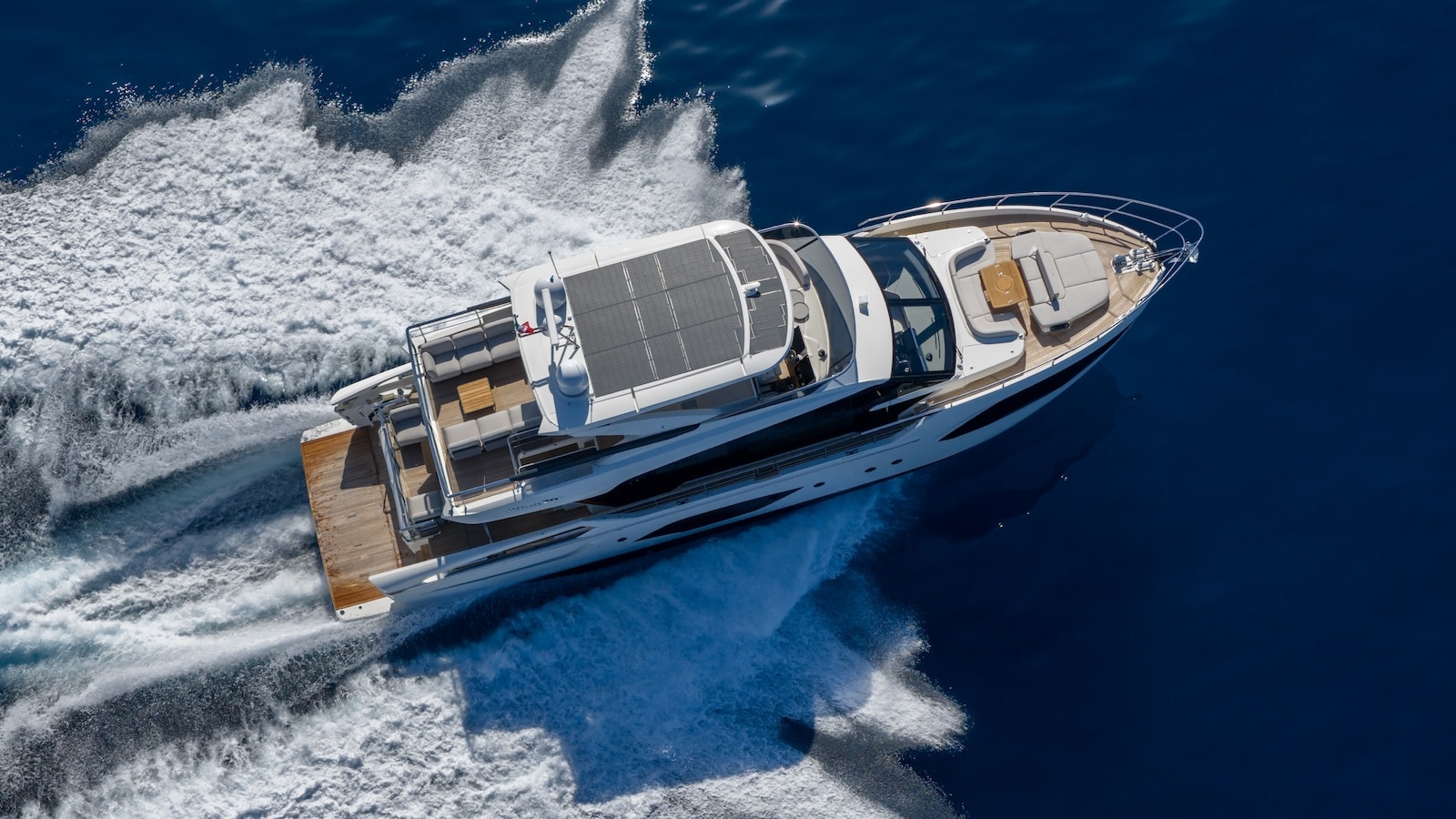 Passée la digue, nous mettons le cap au sud. La mer est longue, formée par une houle résiduelle de sud-ouest, idéale pour mettre la carène à l’épreuve. À 1 000 tours, on navigue à 8 nœuds, avec une consommation moyenne d’environ 4,5 litres par mille. La sensation est de totale détente : aucune vibration, aucun bruit de fond, seulement le doux glissement de l’eau le long de la coque. À 1 500 tours, le 70 Fly déjauge en douceur et se stabilise à 15 nœuds. Aucune transition brutale, aucun changement d’assiette perceptible : le bateau s’allonge sur l’eau et accélère avec grâce.