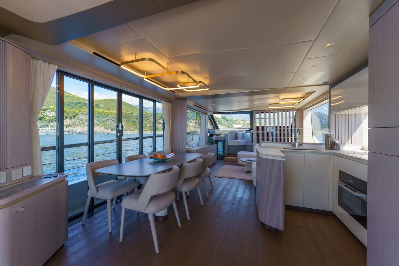 À l’avant, un grand espace lounge accueille un vaste solarium avec une table centrale rabattable pouvant se transformer en coin repas. Les finitions sont impeccables : coussins parfaitement ajustés, mains courantes intégrées et matériaux de qualité transmettant solidité et raffinement.