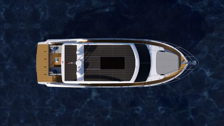 Le choix structurel des panneaux solaires se prête non seulement à l’écologie mais aussi au design. Le Cruiser 48 Coupé, par exemple, dispose d’un ensemble de trois panneaux solaires de deux kilowatts, dont l’un est transparent et fait de verre isolant.