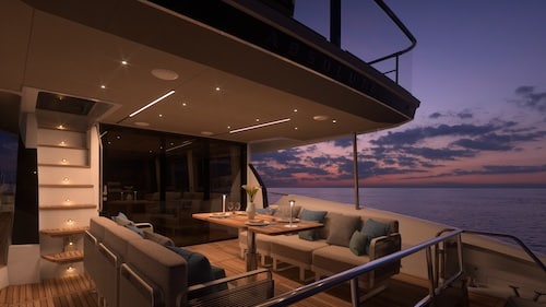 Le 60 FLY complète ses qualités avec deux salons (l’un sur le pont principal et l’autre sur le pont supérieur), des meubles modulaires dans le spacieux cockpit arrière et un poste de pilotage doté de technologies et de fonctionnalités de pointe.