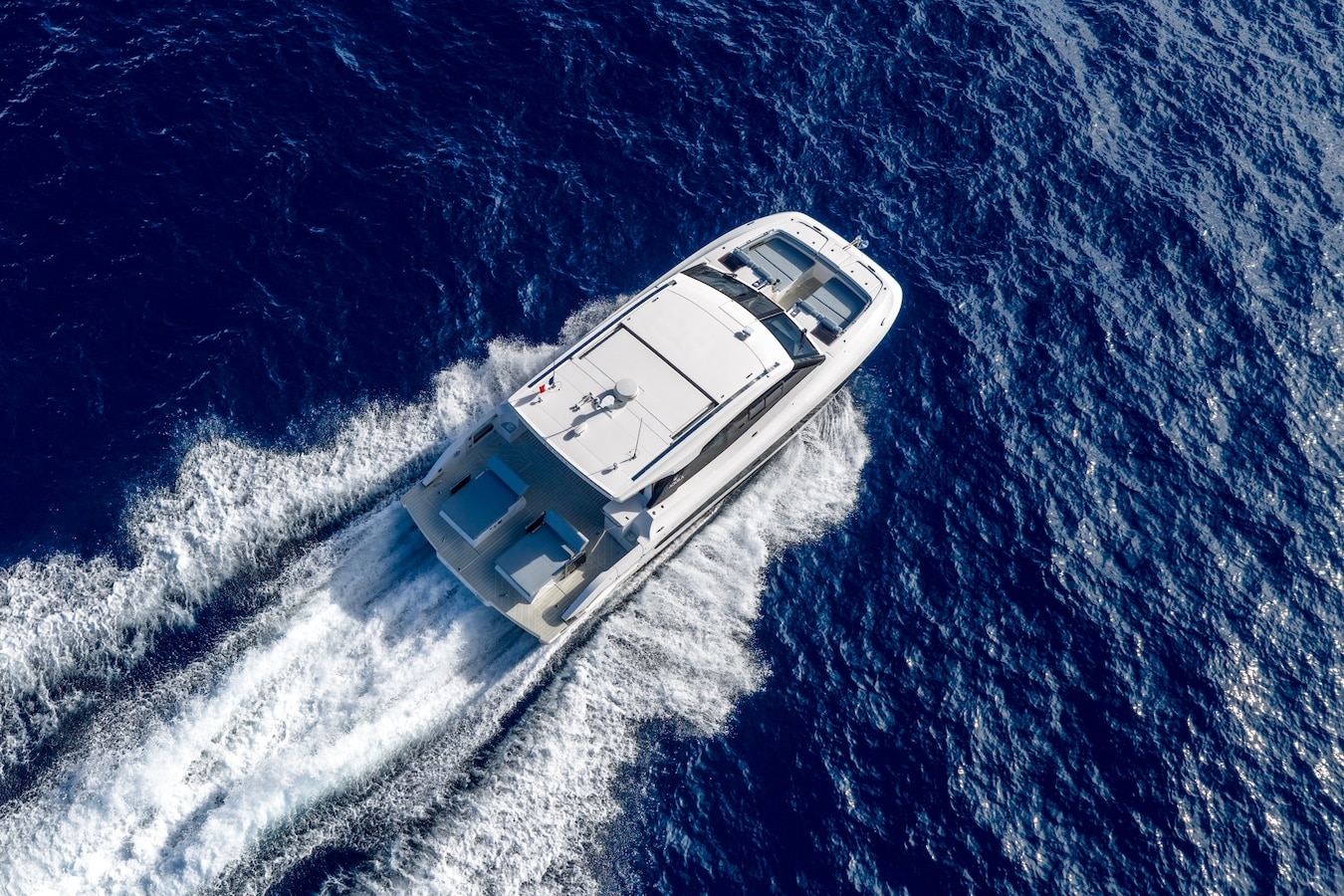 Nous accélérons davantage. Les manettes avancent et les deux Volvo D6 répondent avec vigueur. L’Aquila 42 Coupé accélère franchement, sans jamais donner l’impression d’effort. Les instruments montent : 37 nœuds, puis 40, jusqu’à 41,3 nœuds à pleine charge, toujours face à la mer. Même à ces vitesses, le comportement reste stable et le confort à bord n’est jamais compromis. C’est là qu’on comprend la différence d’un catamaran bien conçu : les deux coques fendent l’eau avec une résistance minimale, tandis que le foil maintient le pont presque parfaitement horizontal.