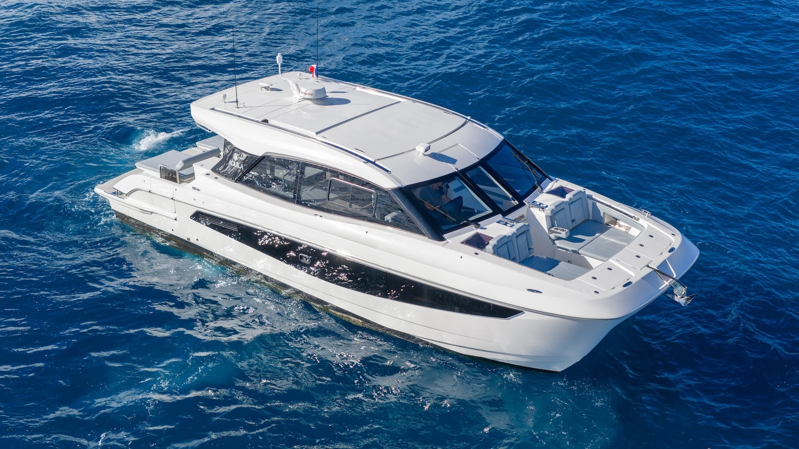 Nous accélérons. À 12 nœuds, la coque commence à se soulever légèrement et le sillage s’allonge : nous sommes déjà en pré-déjaugeage. Sans forcer davantage, le bateau accélère en douceur jusqu’à 18 nœuds, et c’est là que le foil entre en action. Ce n’est pas un foil « volant » comme sur les monocoques de course, mais une lame hydrodynamique capable de générer une force de portance qui allège la coque de presque la moitié de son poids. Le résultat? Une navigation extraordinairement souple, fluide et silencieuse, même face aux vagues. La différence est évidente : le bateau glisse sur l’eau, il ne la fend pas. À 20 nœuds, toujours face à la houle, la consommation moyenne se stabilise autour de 4 litres par mille nautique. Un chiffre remarquable pour un bateau de cette taille et de cette puissance, signe que l’efficacité du foil et la répartition des volumes de coque fonctionnent en parfaite synergie.