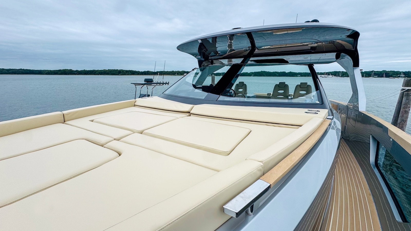 La zone avant est dédiée à la détente absolue : un grand bain de soleil pour cinq personnes est flanqué de deux canapés opposés et de nombreux porte-gobelets intégrés. Pour compléter l’aménagement, une toile d’ombrage en maille soutenue par des mâts en fibre de carbone permet de créer des zones d’ombre sans compromettre la vue.