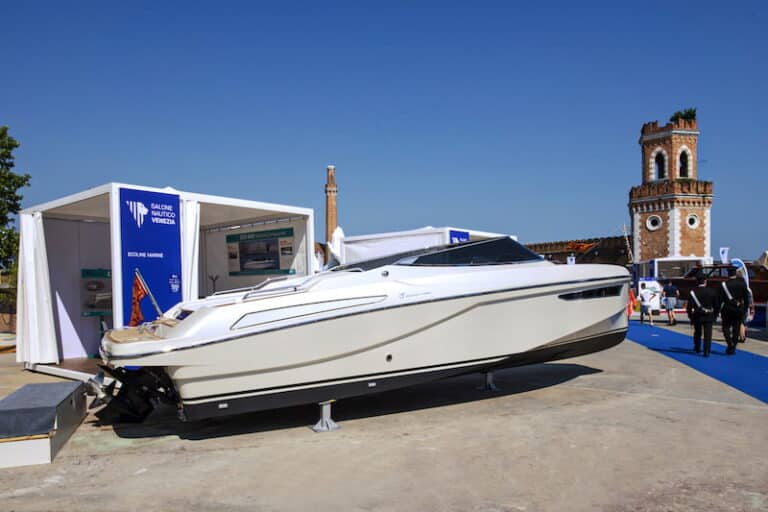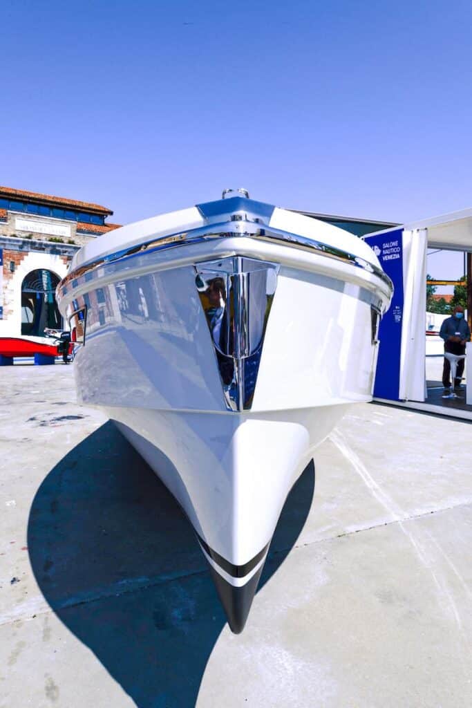 La version standard du bateau est équipé d’un moteur sterndrive turbodiesel de 170 Kw/330ch avec pied Mercruiser. Le modèle exposé à Venise, le haut de la gamme hybride, est propulsé par un moteur endothermique combiné avec un moteur électrique de 30 kW (le 20 kW est le standard), deux batteries LiNMC de 13,14 Kwh, accessoires et détails en acajou verni. Le chantier offre trois propulsions possibles: diesel, électrique et hybride. L’aménagement inclut deux sièges avec table ou un salon typique des day cruiser.