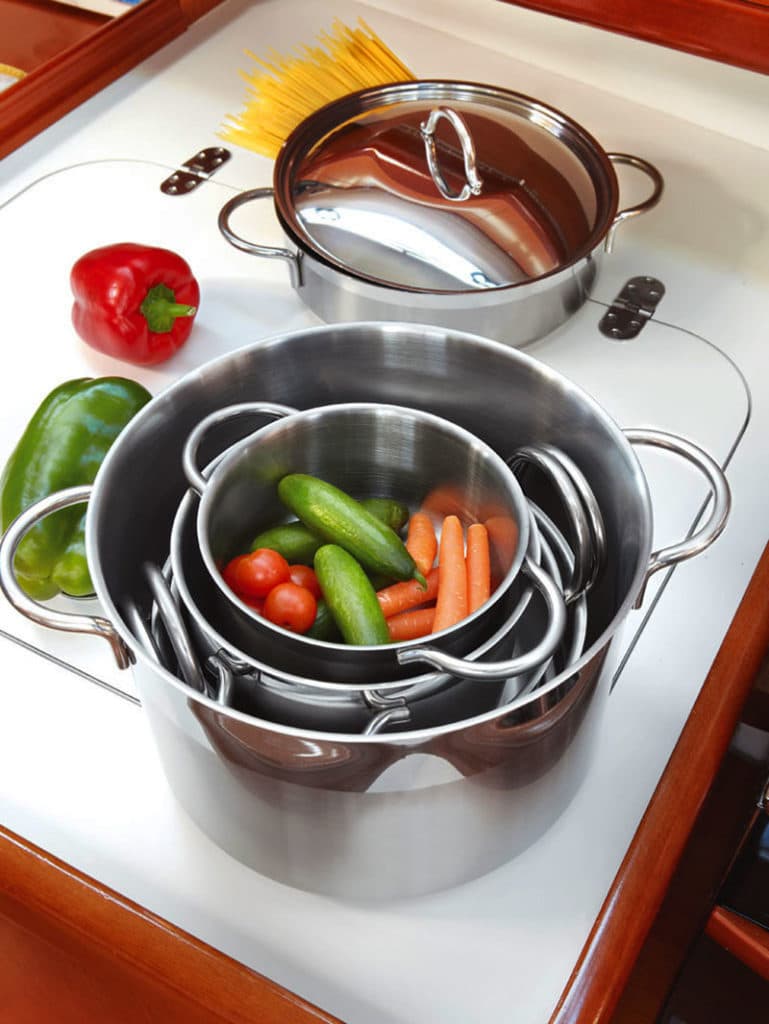 Après, vous devez tenir compte de votre surface de cuisson, du nombre de casseroles dont vous disposez et de leur compatibilité avec les espaces sur les feux. Une bonne option est représentée par des casseroles empilables aux poignées amovibles.