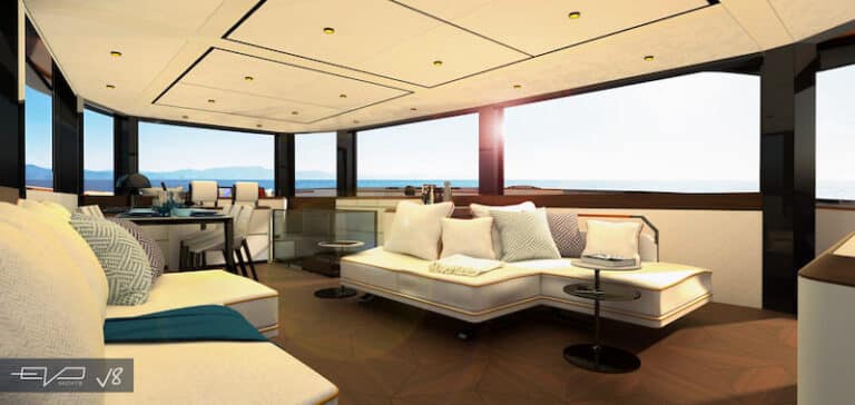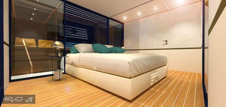 Complètement personnalisable en termes d’aménagement, l’Evo V8 esy disponible dans une version avec trois cabines invités pour 7 personnes et une cabine équipage pour 2, situées sur le pont inférieur avec la cuisine. Le pont supérieur, par contre, se caractérise par un grand salon panoramique avec des fenêtres à ouverture verticale et deux passerelles latérales qui entourent le rouf carré, tandis que la proue offre à nouveau un espace de vie élégant et discret.