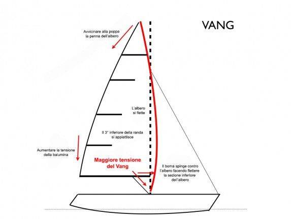 En effet, en plus de l’abaisser, il met la bôme en compression contre le mât, ce qui le fait fléchir – nous parlons de mâts construits pour fléchir, pas de vieux bateaux avec des mâts rigides – avec une série d’influences sur la grand-voile.