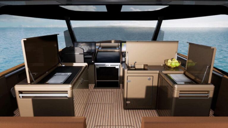 Vers l’arrière, la capote intègre un bimini, deux trappes ou un toit ouvrant électrique qui peut être ouvert au-dessus de la barre, et des fenêtres latérales permettent de faire entrer l’air frais et la lumière du soleil. A bâbord se trouve la cuisine avec un réfrigérateur et deux cuisinières à gaz ou électriques et un grill à gaz en option. Sur le côté tribord, en revanche, il y a un évier et beaucoup d’espace pour la vaisselle et les casseroles. Un barbecue peut être placé derrière les sièges et commandé depuis la plate-forme arrière. Une autre option possible est une plate-forme arrière plus longue et mobile hydrauliquement.