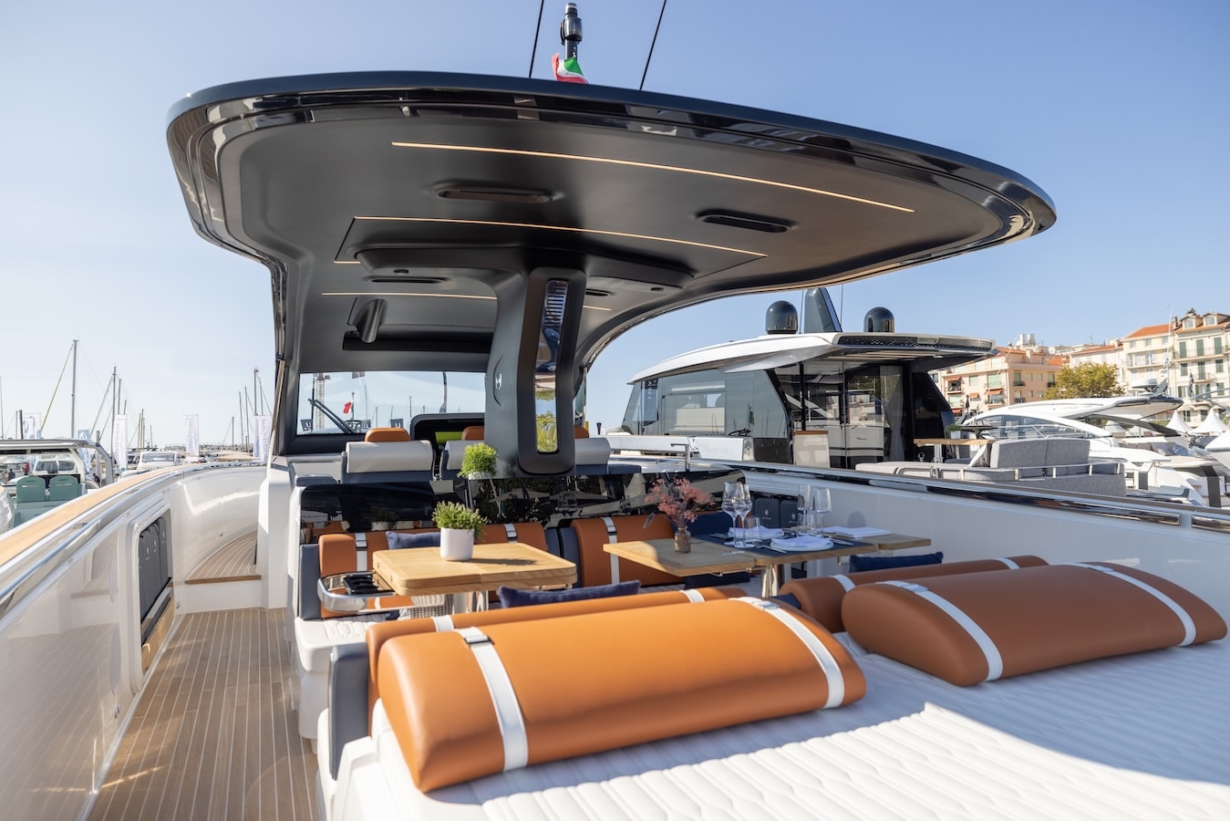 Ls division Personnalisation extérieure, autre point fort d’Invictus, offre jusqu’à dix-sept options couleur de coque — métallisés ou classiques, également extensibles aux intérieurs — associés à plus de dix-sept combinaisons de sellerie. De la même manière, la Personnalisation intérieure permet de redéfinir les espaces sous le pont selon les besoins de l’armateur, dans le respect des limites structurelles, offrant d’infinies possibilités de configuration pour créer des environnements véritablement uniques. Enfin, la division Durabilité et Innovation représente l’âme la plus expérimentale du laboratoire, engagée dans la recherche de matériaux écocompatibles et de solutions technologiques à faible impact environnemental.