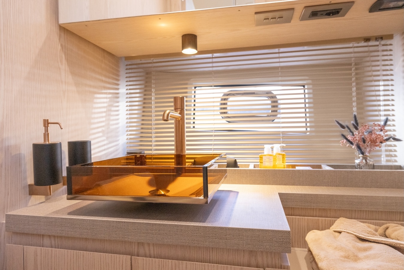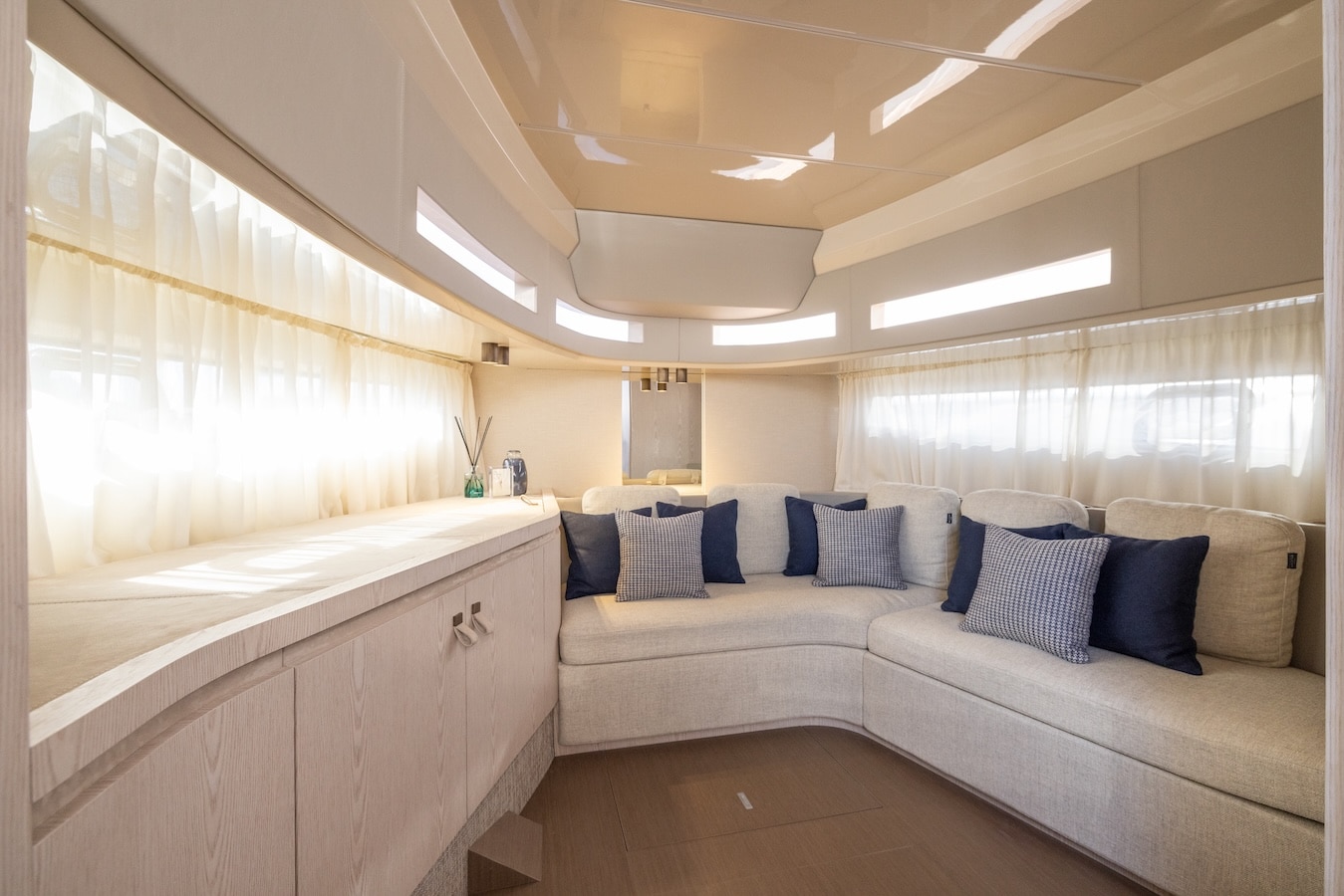 Le résultat est un espace plus léger, plus lumineux et plus naturel, fini avec des essences de bois et des textures tactiles qui transmettent chaleur et authenticité. Un éclairage calibré avec précision contribue à créer une atmosphère de bien-être diffus, où technologie et confort cohabitent sans dominer la scène. La palette chromatique, inspirée des éléments de la nature — sable, eau, pierre — renforce le lien entre le bateau et le paysage, fusionnant design et nature en une expérience sensorielle unique.