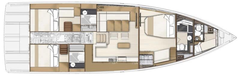 La cabine du propriétaire est un véritable cocon de bien-être, avec une grande couchette à bâbord, de nombreux rangements et une coiffeuse. Le traitement du plafond et l’éclairage indirect créent une atmosphère chaleureuse. La salle de bain remplit le bau avant. Une cabine de skipper peut être ajoutée en option.