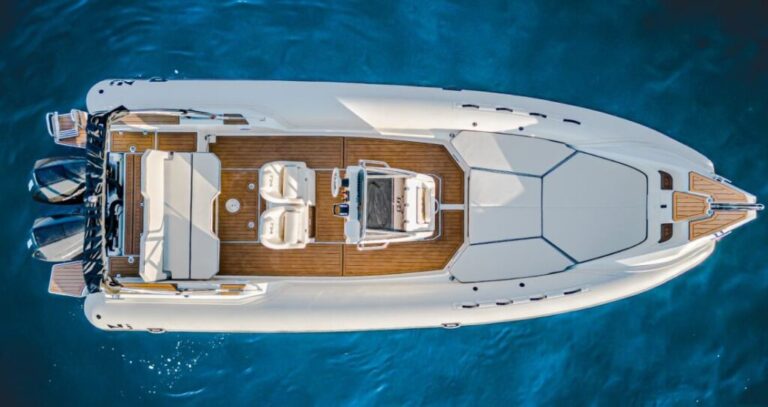 Enfin, la poupe abrite une dernière innovation pratique, à savoir les plates-formes de bain mobiles qui, selon votre choix, peuvent accueillir un ou deux hors-bord jusqu’à 450 cv: ce qui signifie aller vite, mais aussi profiter de cet aspect de la mer que nous ne pouvons pas laisser de côté, à savoir le plaisir et l’adrénaline de la conduite. Dans l’eau, il est très stable, bien planté, mais dès qu’il entre en planage, ses 1400 kg (à sec) disparaissent pour laisser place à une grande maniabilité, ce qui s’ajoute à la liste des aspects positifs.