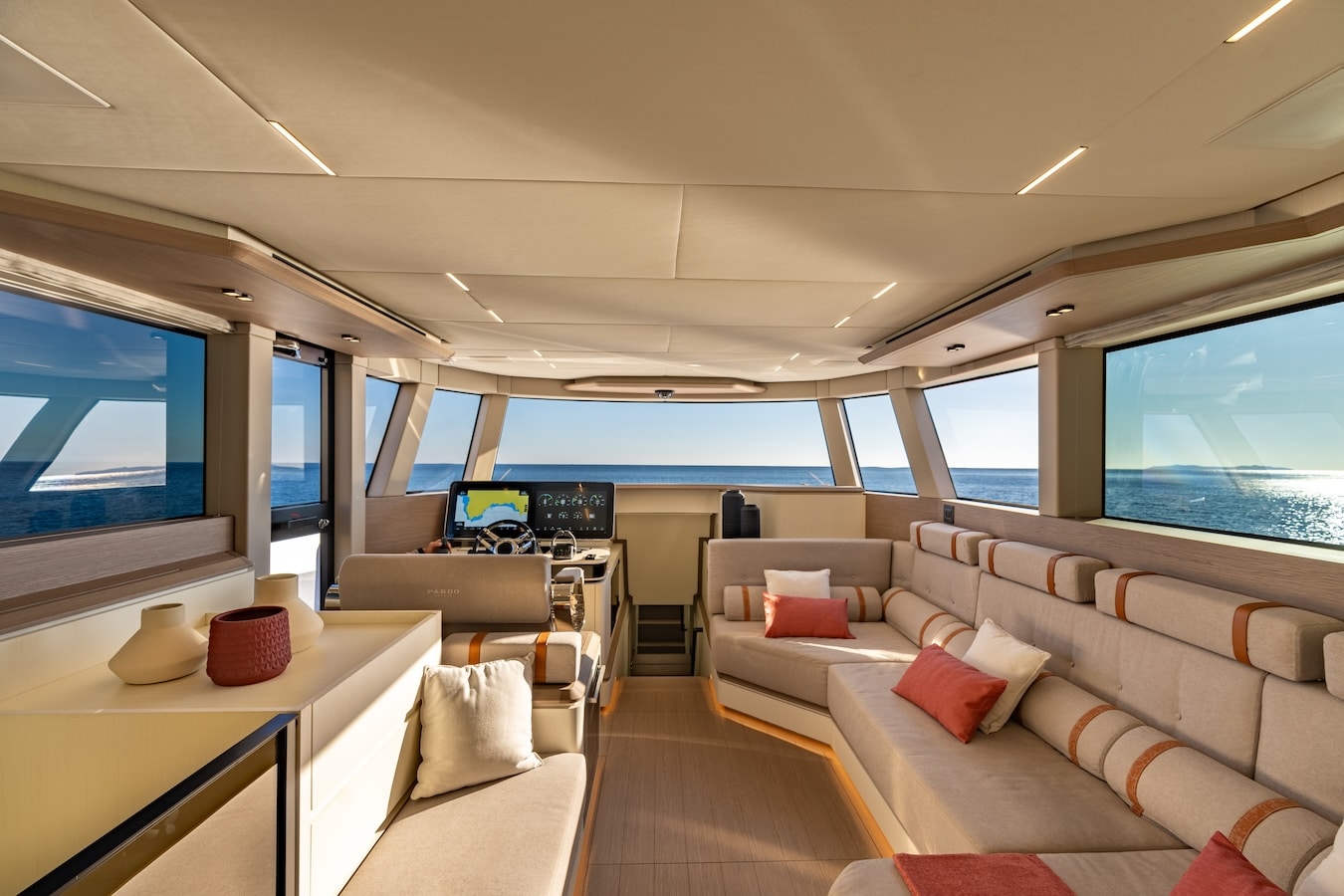 La console de pilotage est entièrement nouvelle : elle intègre un système domotique développé avec Garmin et personnalisé pour Pardo Yachts, simplifiant la gestion de toutes les fonctions à bord. Le confort est garanti par un système de climatisation Dometic qui dessert également la salle de bain – un détail rare sur des bateaux de cette taille.