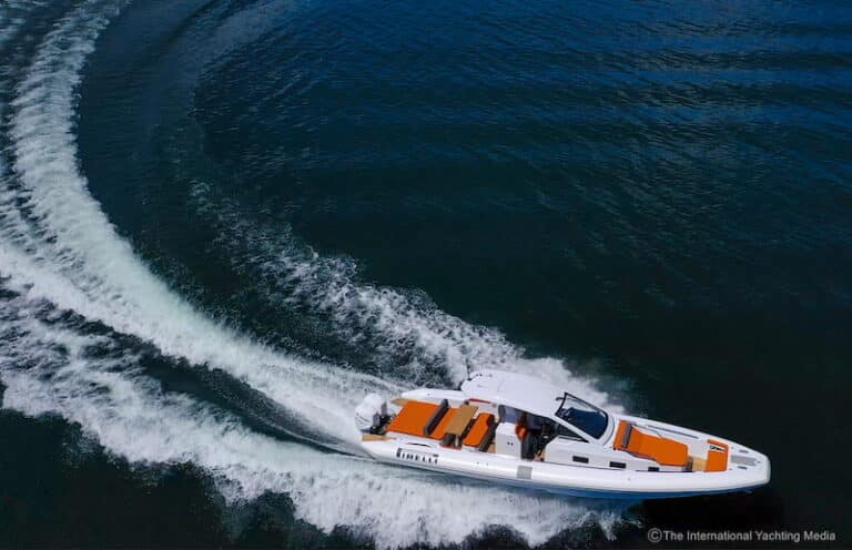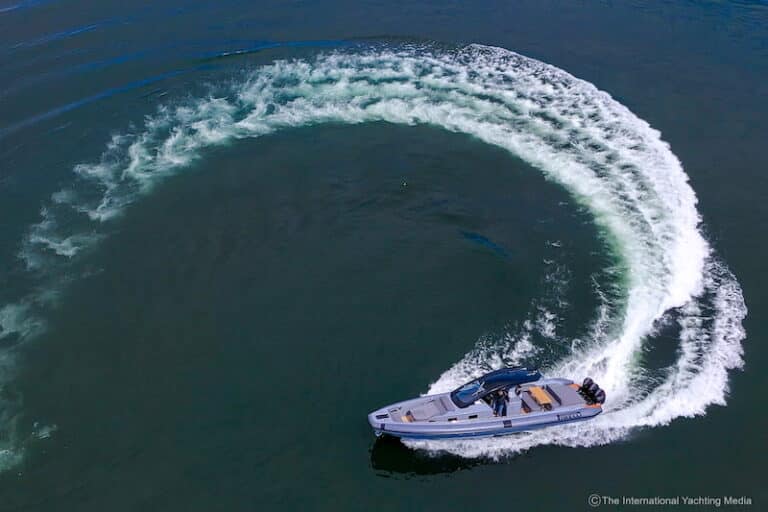 Une fois encore, j’effectue une série de virages serrés. Des virages et contre-tours que seul un Maxi-Rib de haute lignée peut se permettre, mais nous sommes à bord d’un Pirelli 42 et il n’y a vraiment aucune trace de bavure. La carène survole littéralement l’eau, maintenant le bateau parfaitement horizontal et, lorsque je traverse les vagues produites par mon propre sillage, il les fend avec une douceur absolue, presque comme si l’eau cédait au rythme rapide d’une telle beauté.