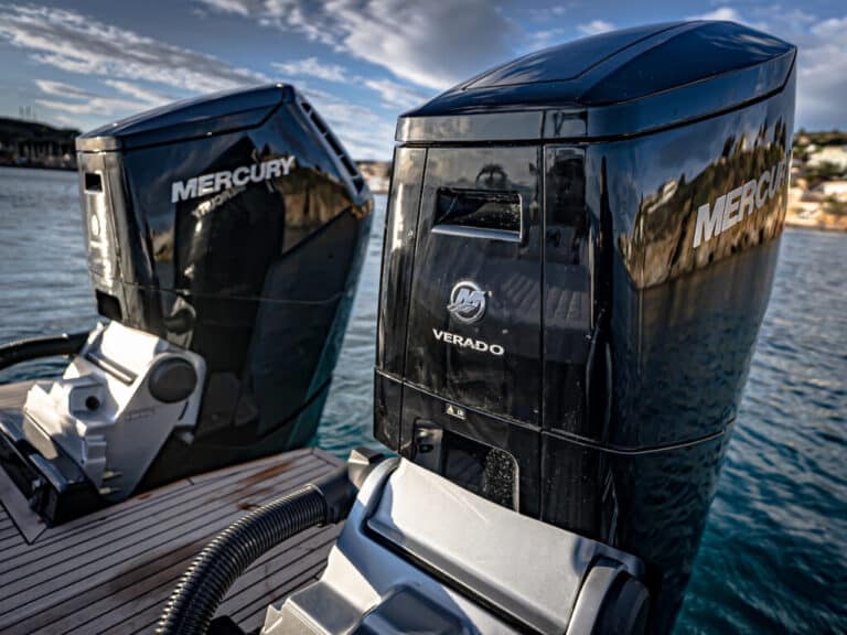 Très peu de chantiers en Europe ont eu l’occasion d’équiper leurs bateaux avec les nouveaux moteurs Mercury Verado. Spectaculaires à voir et dotés de performances et d’une autonomie sans précédent, ce sont les hors-bord les plus puissants du monde, et le Prince 43 CC est vraiment le “char” parfait à notre avis. L’accélération que ces deux moteurs révolutionnaires confèrent au bateau est littéralement fulgurante, et la vitesse que l’on peut atteindre avec le bateau à pleine charge est proche de 55 nœuds à 6500 tr/min: une performance puissante que Nuova Jolly a voulu garantir avec une sécurité adéquate, en permettant de contrôler les transmissions avec la plus grande précision et en accordant parfaitement le bloc moteur avec la carène de manière à le maintenir toujours immobile et aligné même pendant les virages les plus extrêmes.
