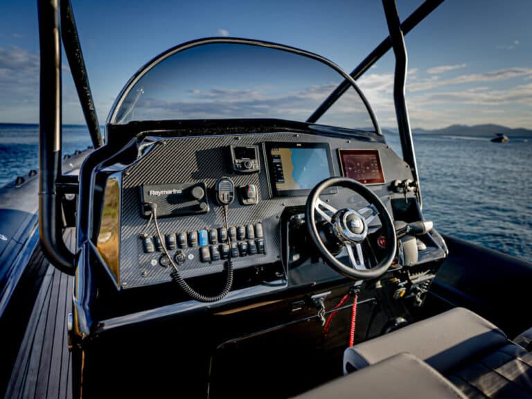 La console centrale est résolument prestigieuse, avec beaucoup de carbone entre les instruments. Il y a beaucoup de place pour tous les équipements électroniques choisis par le propriétaire. La protection est garantie non seulement par le toit mais aussi par le pare-brise encadré par un cadre en acier inoxydable vraiment sportif.
