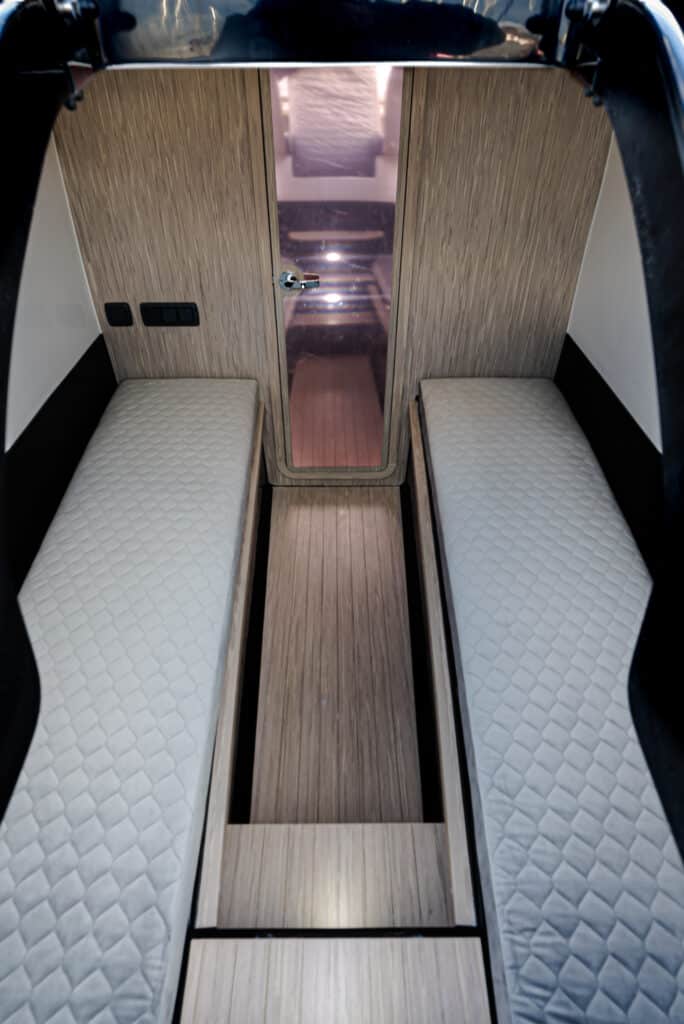 D’une manière générale, le design de la cabine, ainsi que de l’ensemble du bateau, est résolument inspiré de l‘automobile de luxe, et donne déjà un avant-goût de la vitesse de croisière, mais sans négliger le confort afin de pouvoir dormir au moins une nuit à l’ancre.