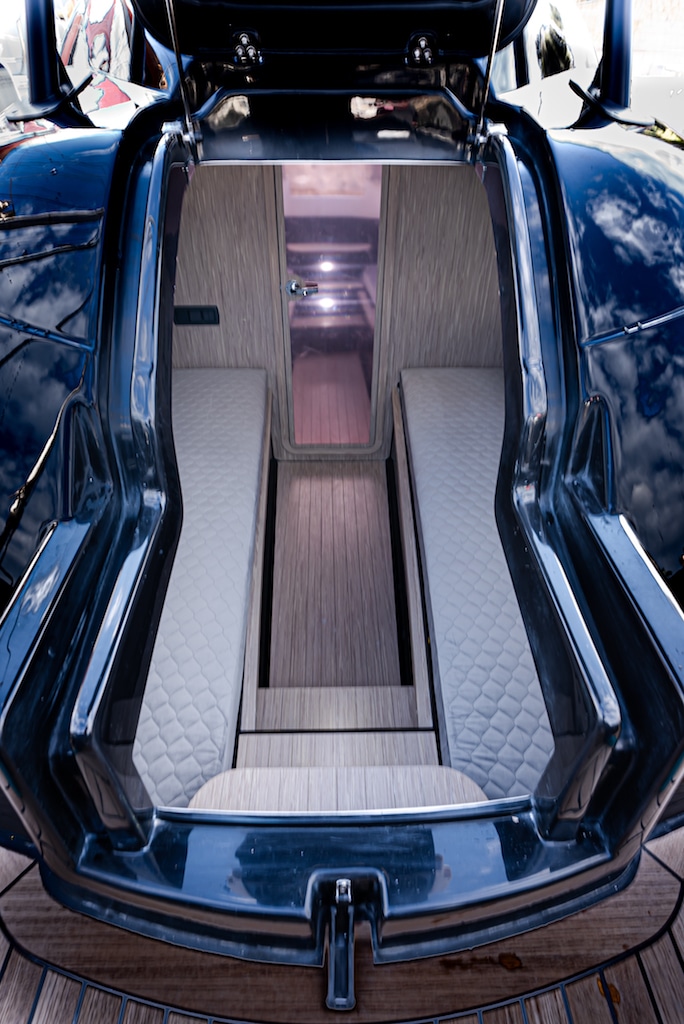 En termes d’espace, en bref, on trouve tout ce dont on a besoin sur un bateau qui n’est évidemment pas un yacht, mais dont les coûts d’entretien et d’amarrage au port sont beaucoup moins élevés. Par exemple, les deux tables, avant et arrière, sont alimentées électriquement et sont entièrement rétractables pour créer l’ambiance dont vous avez besoin en fonction des personnes à bord. Ici aussi, le concept d'”espace libre” revient, ou se transforme, par exemple en bain de soleil dans le cas de la table sur le pont avant.