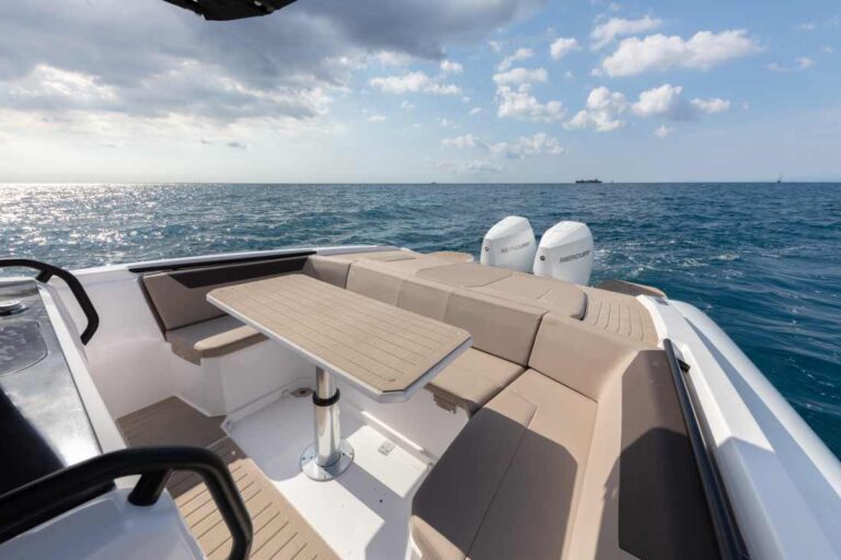 Ensuite, il y a le T-Top. Réalisé en cristal, de couleur noire, il donne un certain touche d’élégance à ce bateau, comme si l’on portait le bon accessoire qui met en valeur l’ensemble du look, tout en laissant de grands angles de vue tout autour et en couvrant du soleil le tableau de bord, qui présente une splendide forme de diamant, également réalisé en cristal noir, cachant une toilette à l’avant. Non seulement la beauté mais aussi une efficacité remarquable tant en termes de protection, comme je l’ai dit à la fin du test je n’ai même pas eu une goutte d’eau sur moi, mais aussi en termes de performance, puisque son inclinaison favorise un passage plus aérodynamique de l’air.