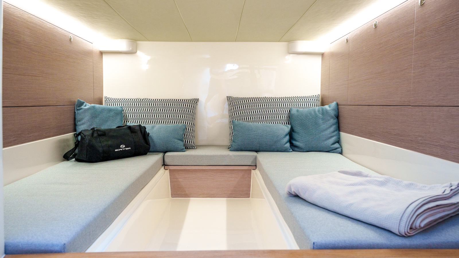 Comme pour l’Envy 1200, le chantier a opté pour un aménagement mixte sur ce Maxi-RIB. De la poupe jusqu’à la barre, l’aménagement est de type walk-around, tandis que la proue a été conçue avec une légère surélévation qui assure les généreux volumes intérieurs indispensables au niveau de confort que Scanner a désormais érigé en norme.