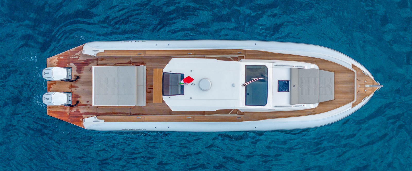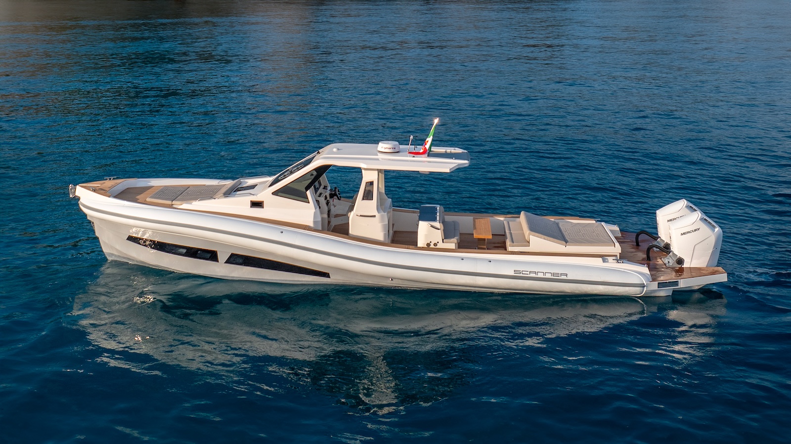 Je pousse les gaz et, malgré ce que je viens de dire, le gros semi-rigide sort instantanément de l’eau, se met dans le plan et accélère sans effort jusqu’à une quinzaine de nœuds. Un phénomène auquel, honnêtement, je ne me serais pas attendu avec la puissance minimale, mais l’excellente géométrie de la coque et le couple puissant des deux V12 fonctionnent extrêmement bien ensemble sur ce Scanner, sans aucune difficulté à gérer les plus de 13 tonnes de déplacement à pleine charge de cette grande embarcation équipée d’une cabine.