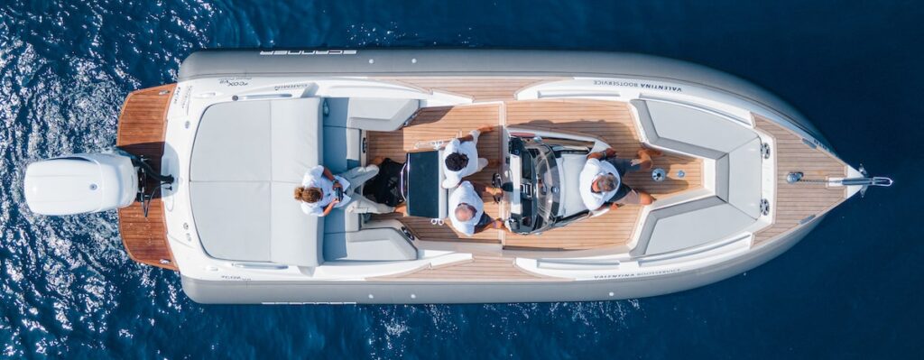 Le Scanner Envy 860 est un bateau open pur. Caractérisé par un plan de pont intriguant, en moins de neuf mètres et grâce à sa largeur de 3,10 mètres, il parvient à créer des espaces dignes d’un Rib de première catégorie. En partant de la poupe, on trouve un grand bain de soleil qui délimite les limites d’un canapé en U pour 4 personnes. Plus à l’avant se trouve le poste de pilotage qui, en plus d’incorporer les commandes, comporte également un siège orienté vers l’avant. La zone avant, quant à elle, dispose d’un canapé convertible qui peut être utilisé soit pour un repas à quatre, soit, en retirant la table et en insérant un coussin, comme un grand bain de soleil supplémentaire.