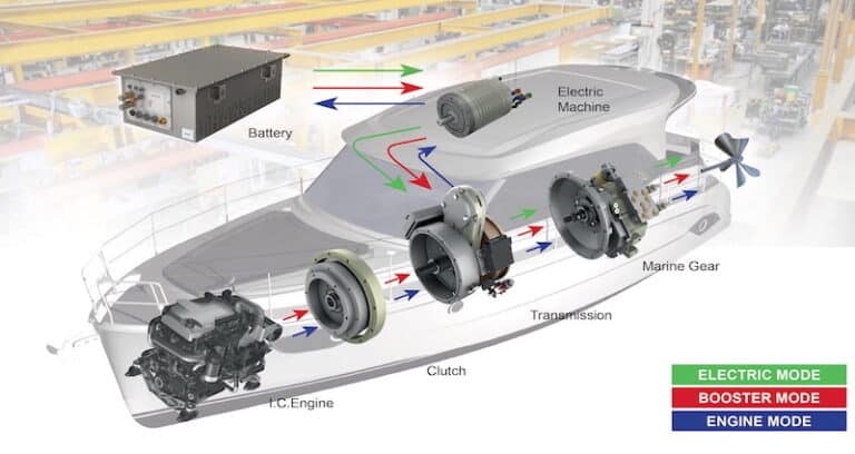 Quant au secteur du yachting, il y a un chantier français qui a embarqué les systèmes électriques de Bellmarine-Transfluid à bord de ses trimarans, les fameux NEEL 56 et 72. Les bateaux sont équipés de deux moteurs électriques DriveMaster de 15 kW à refroidissement liquide montés sur les coques extérieures et d’un moteur thermique placé sur la coque centrale, ce qui permet d’adapter la propulsion à toutes les situations et à tous les horaires de navigation. Les manœuvres sont fluides et la vitesse maximale atteinte par les trimarans est de près de 7kn et sans bruit. Les émissions nuisibles à l’environnement sont, bien entendu, réduites de manière drastique.