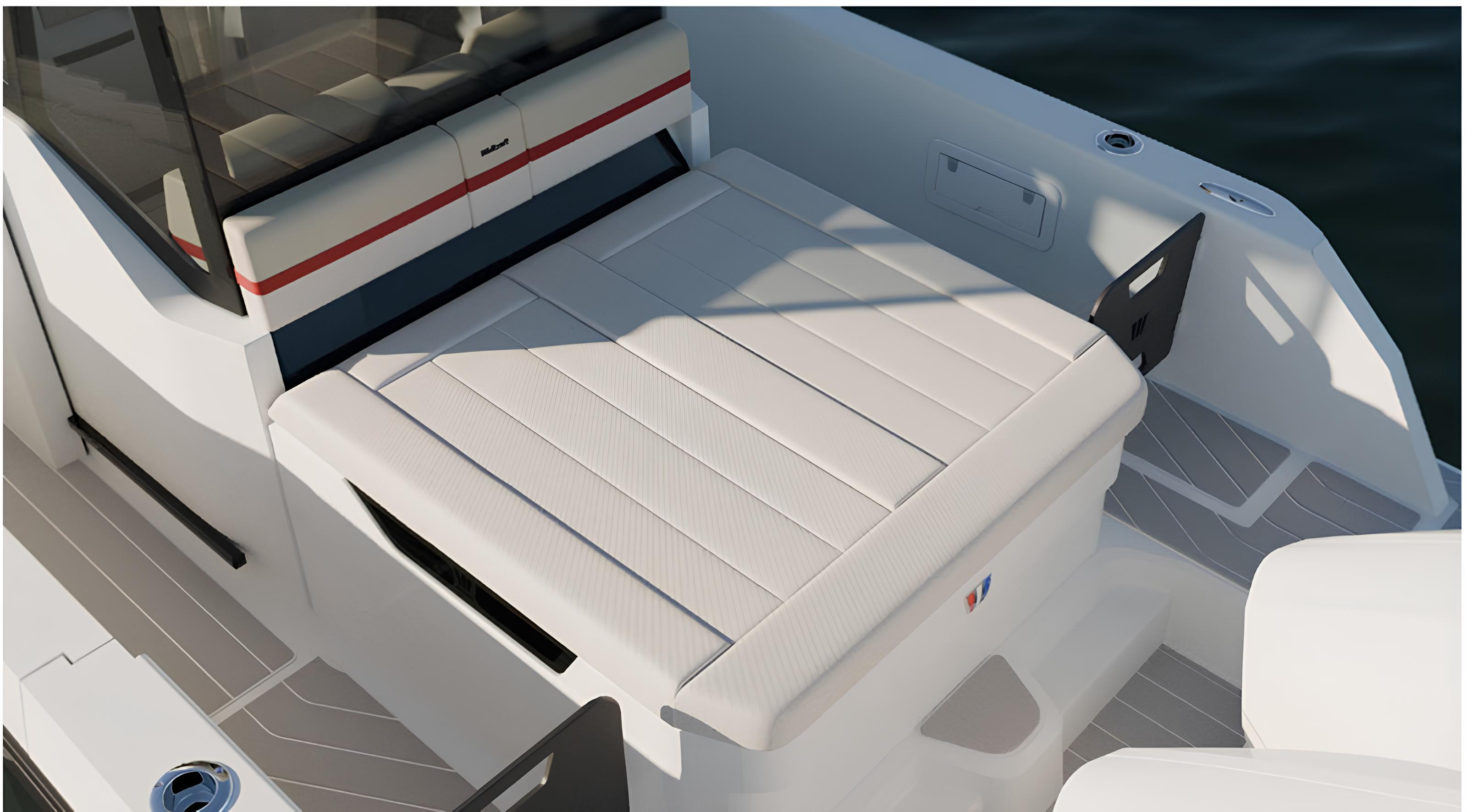 Ceux qui recherchent une expérience plus axée sur la pêche peuvent plutôt compter sur le caractère distinctif de l’aménagement Barracuda, qui transforme le cockpit en une plateforme fonctionnelle équipée d’un banc rabattable, d’un vivier, de tiroirs à appâts et de solutions dédiées aux cannes.